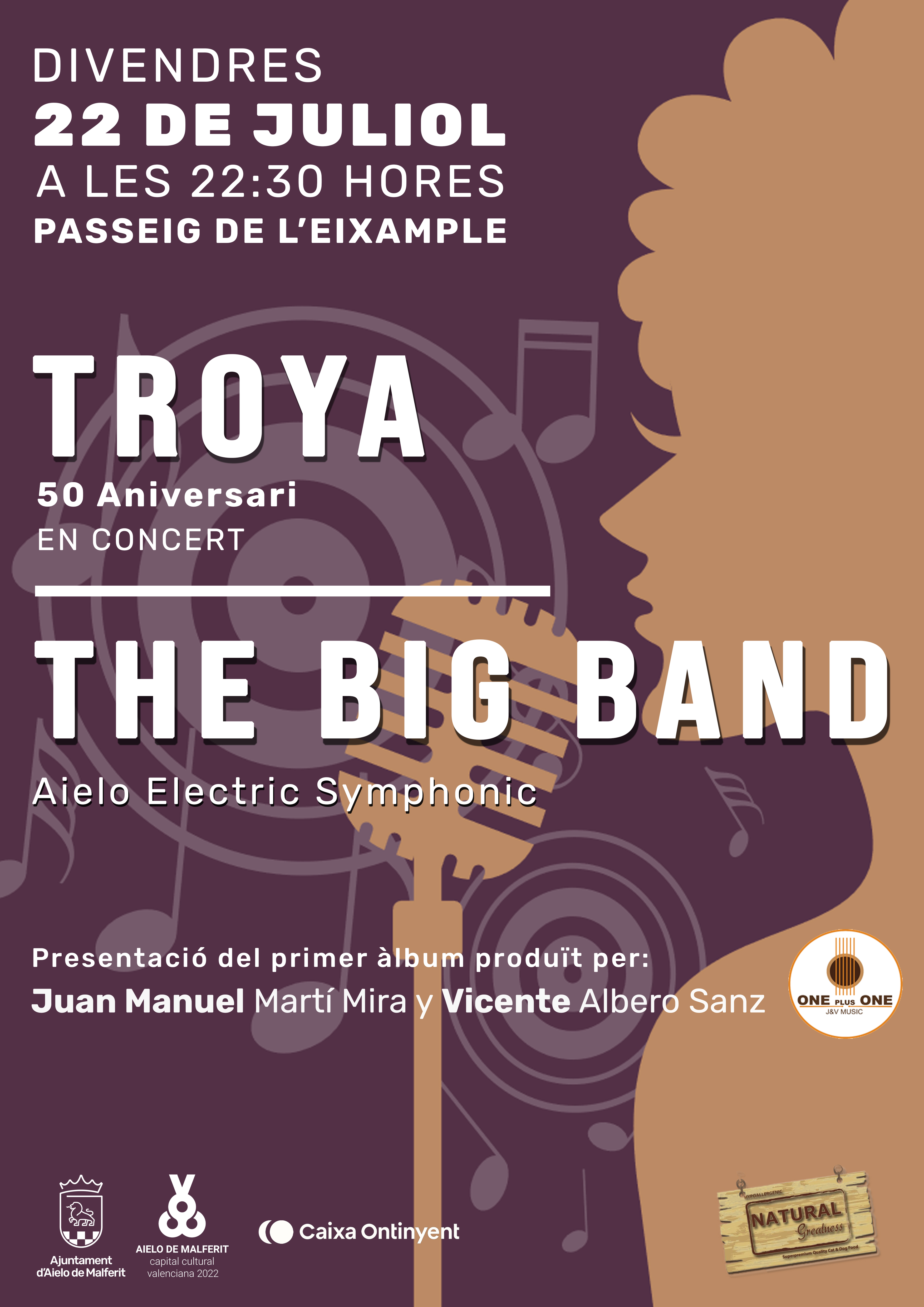 Divendres22 de juliol a les 22:30 hores al Passeig de l'Eixample, podrem gaudir d'una nit de música en directe de la mà de TROYA, celebrant el seu 50 aniversari i del grup THE BIG BAND, Aielo Electric Symphonic.