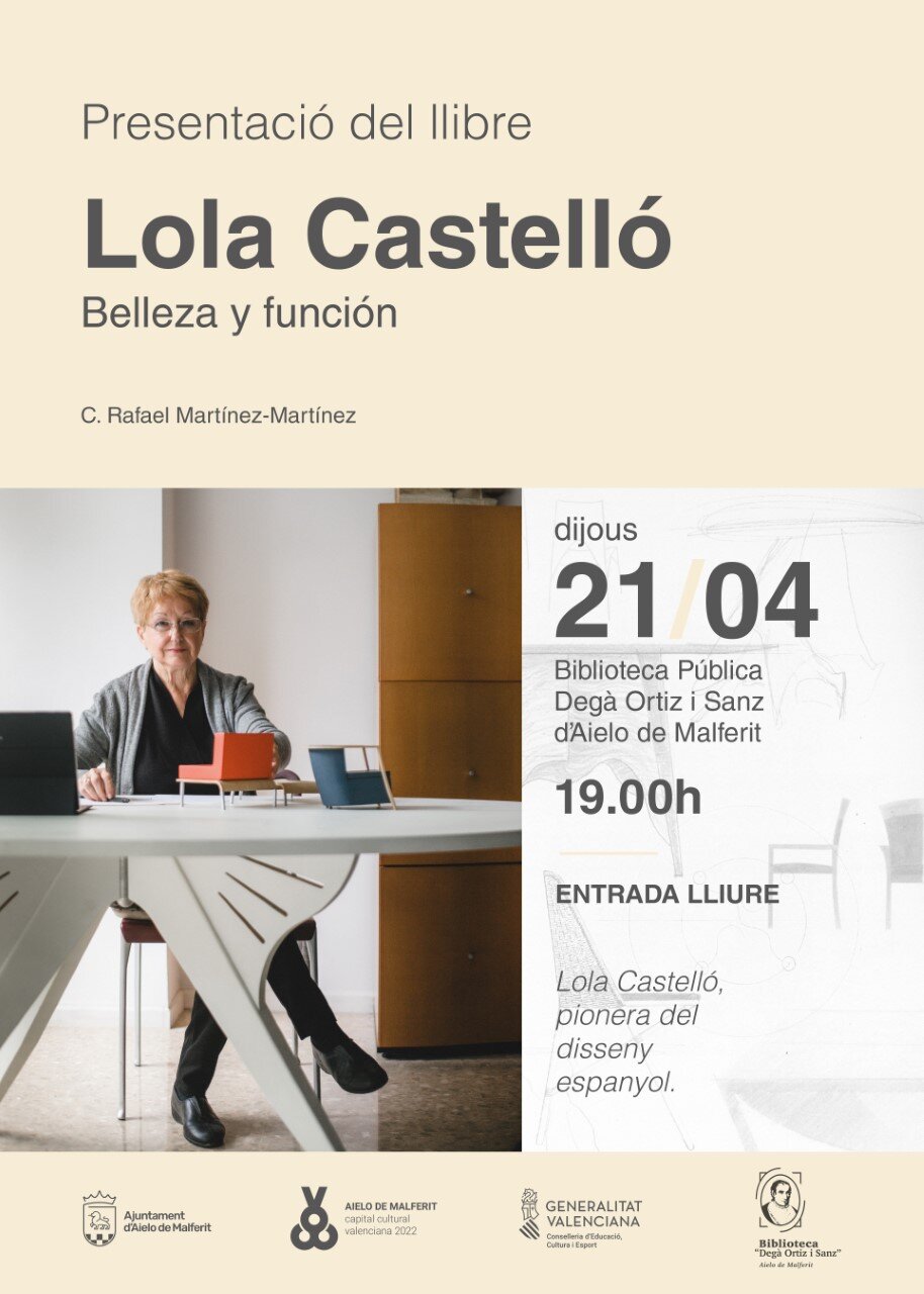 Serà a través del llibre "Lola Castelló, función y belleza" de Rafael Martínez a la Biblioteca Pública Municipal "Degà Ortiz i Sanz" d' Aielo de Malferit, el 21 d'abril a les 19 hores. A l’acte coneixerem la trajectòria de Lola Castelló des del seu vesant professional i la rellevància els seus dissenys sense oblidar la seua vinculació al poble.