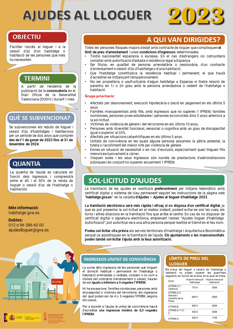 Es subvencionen els rebuts de lloguer i cessió d’habitatges i habitacions per un període de dos anys que comprén de l'1 de gener de 2023 fins al 31 de desembre de 2024, i l'habitatge del qual es troba en el territori de la Comunitat Valenciana.