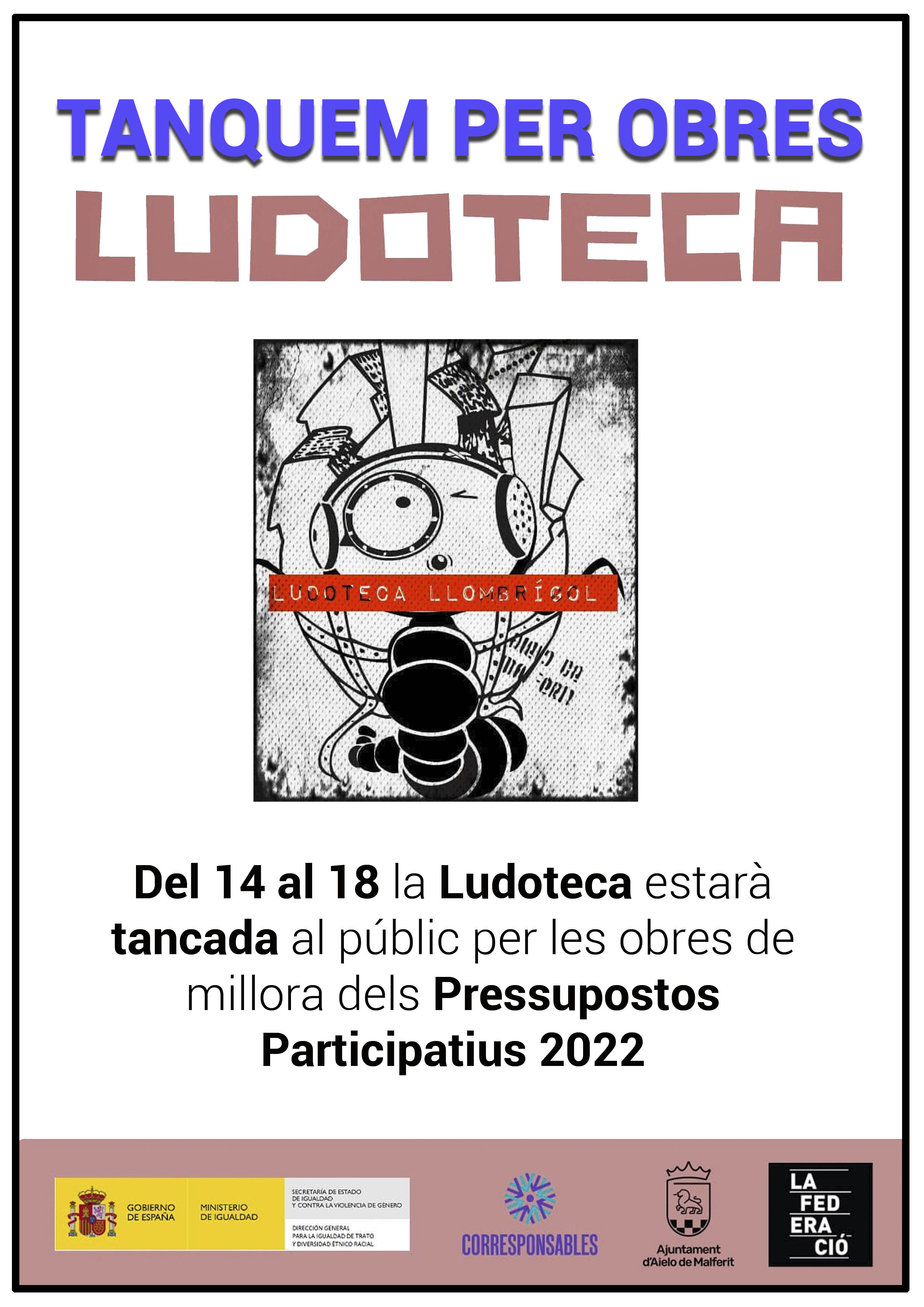 Des de l’Ajuntament informem al usuaris de la LUDOTECA MUNICIPAL que NO es podrà fer ús de la instal·lació del 14 al 18 de novembre, amb motiu de les obres de millora del servei fruit dels pressupostos participatius de l’any 2022.