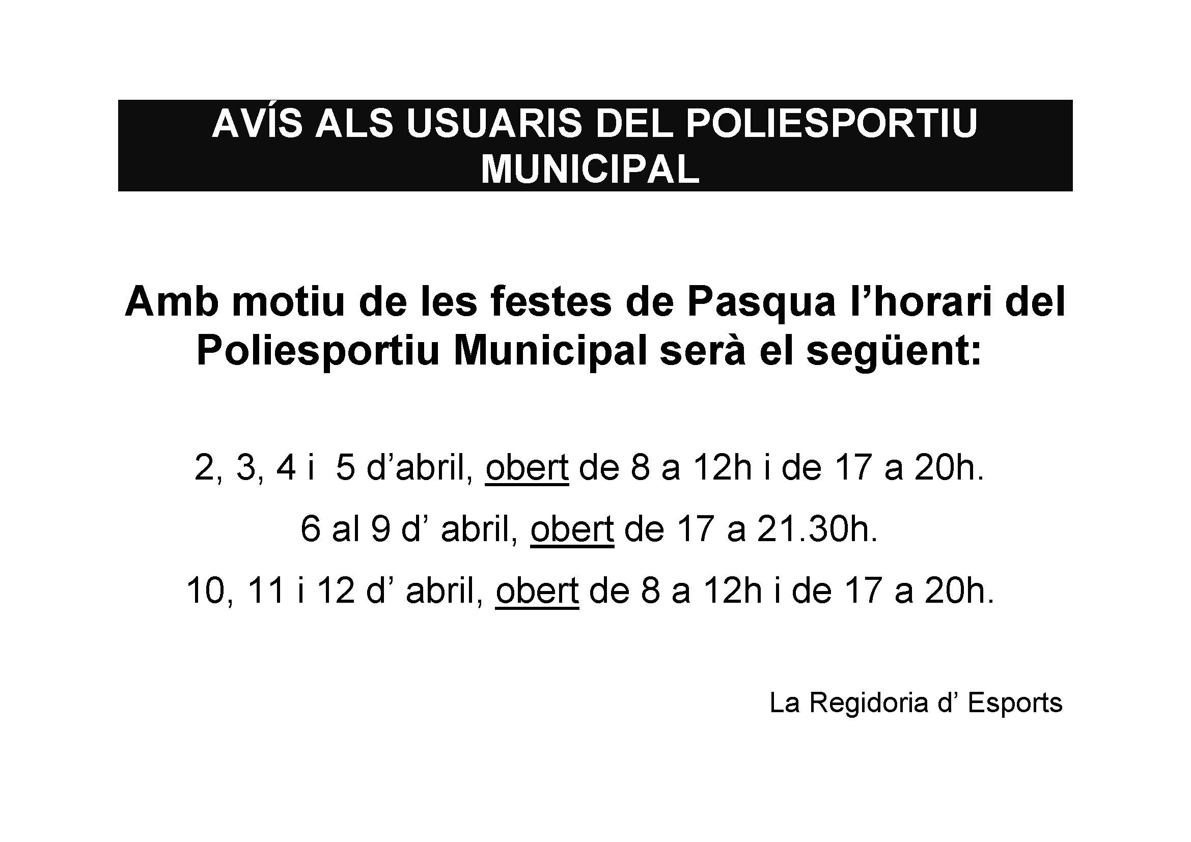 AVÍS ALS USUARIS DEL POLIESPORTIU MUNICIPAL (Horari festes de Pasqua ) - Aielo de Malferit