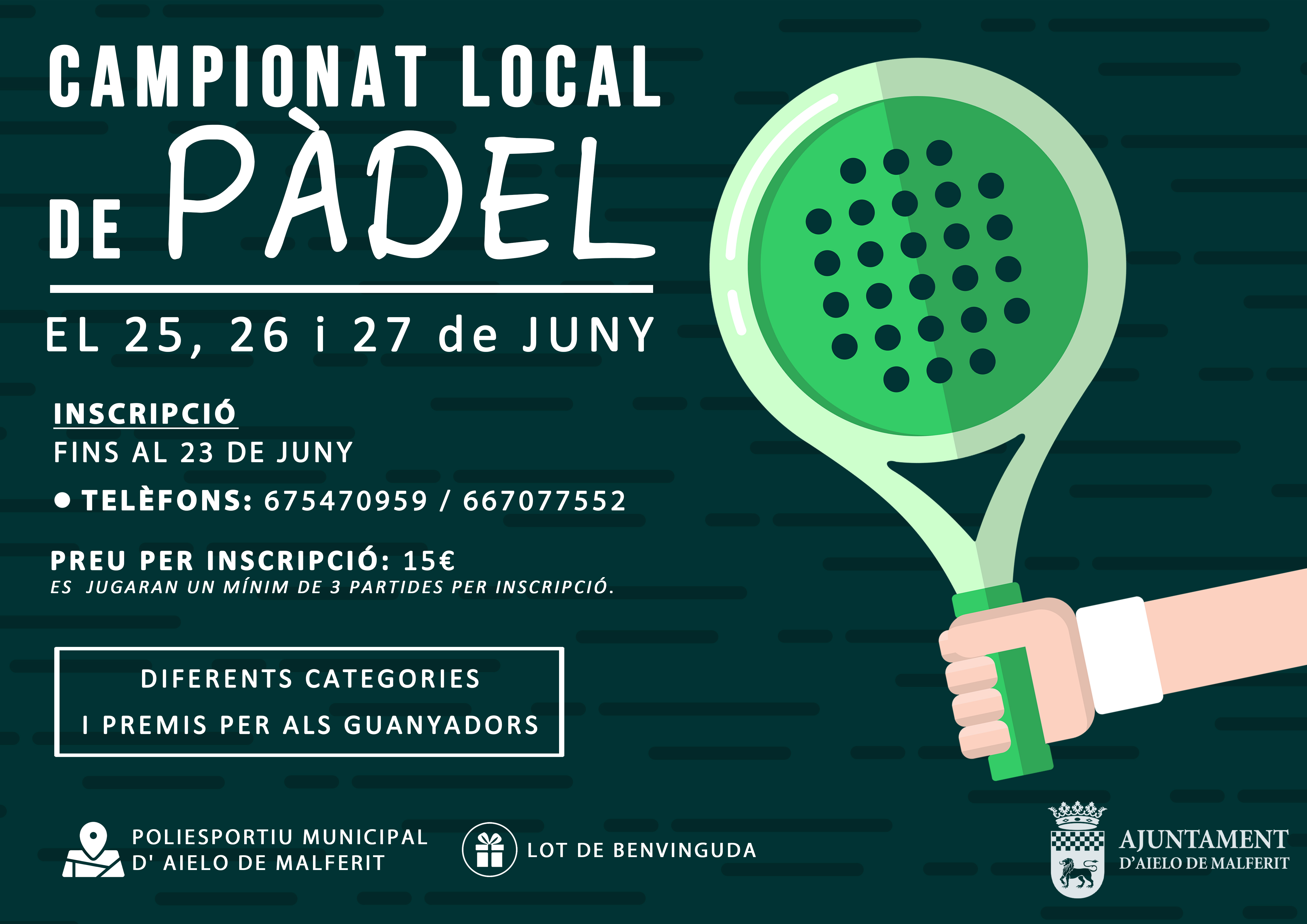 Els dies 25, 26 i 27 de juny, se celebrarà el Campionat de Pàdel Local a les pistes de pàdel del poliesportiu municipal d'Aielo de Malferit.