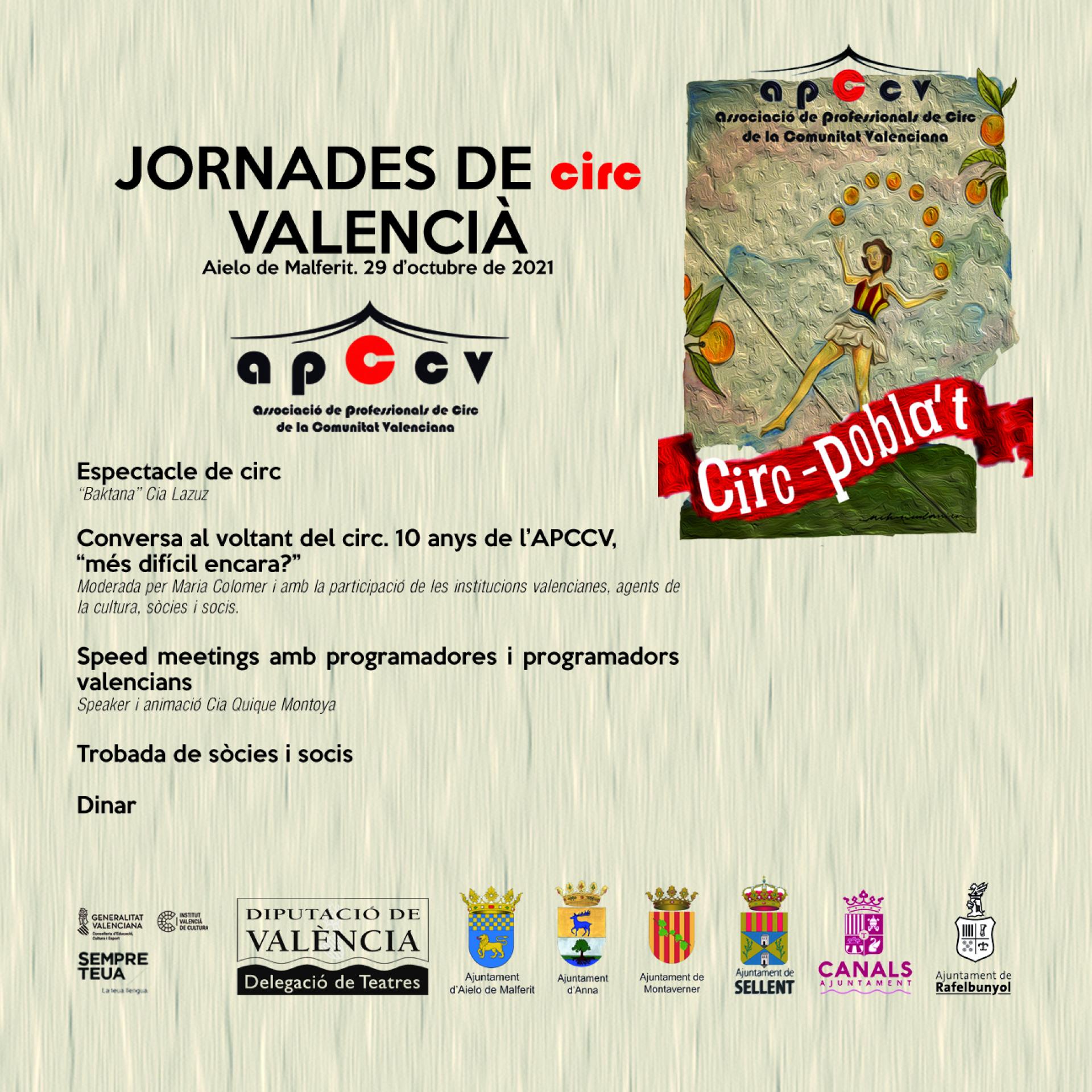 Aielo de Malferit serà la seu de les Jornades de Circ, organitzades per l’ Associació de Professionals del CIRC de la Comunitat Valenciana dintre del programa Circ Pobla’t. L’ objectiu d’ aquesta trobada es promocionar a les companyies i professionals associades i divulgar el circ per municipis valencians.