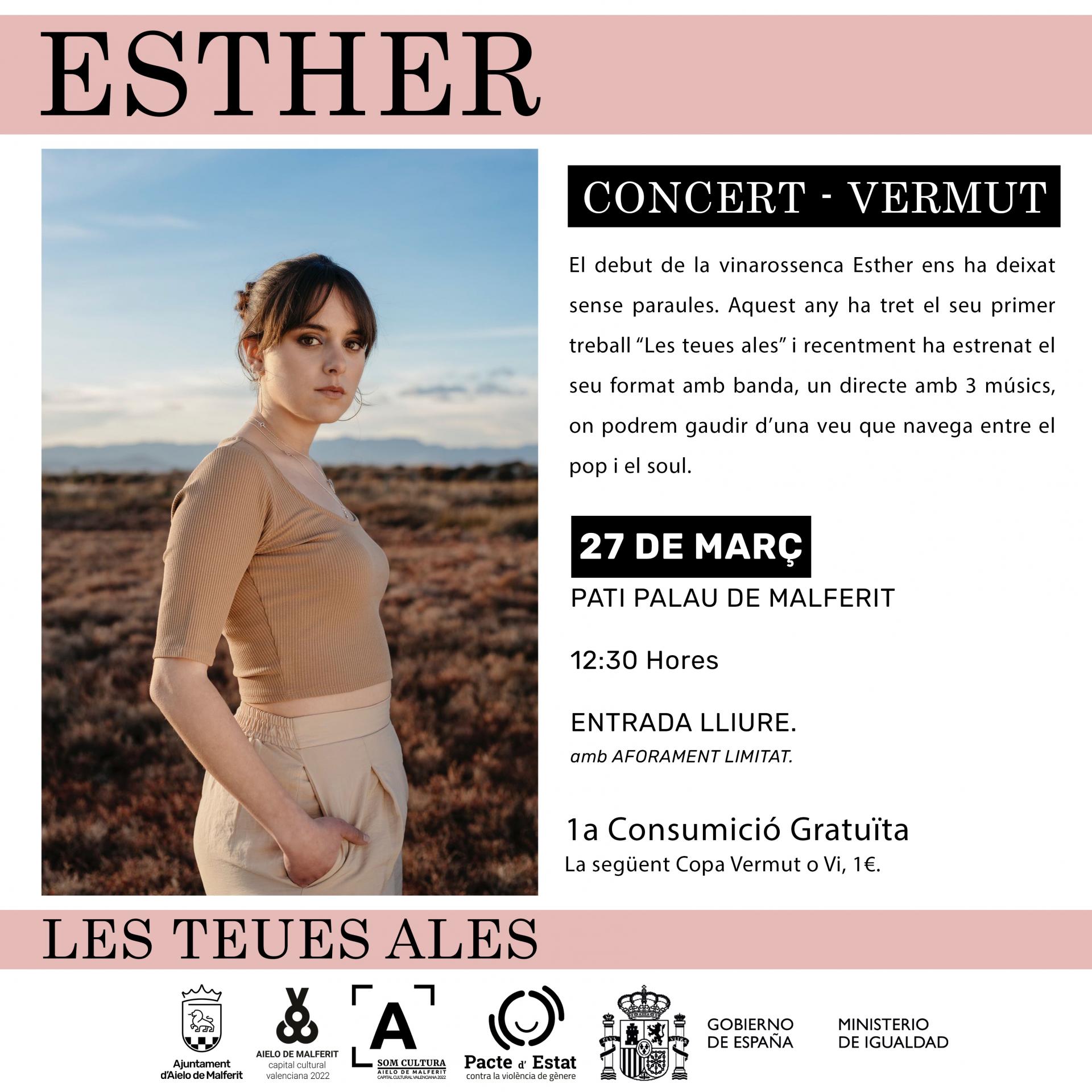 El debut de la vinarossenca Esther ens ha deixat sense paraules. Aquest any ha tret el seu primer treball 'Les teues ales' i recentment ha estrenat el seu format amb banda, un directe amb 3 músics, on podrem gaudir d'una veu que navega entre el pop i el soul.