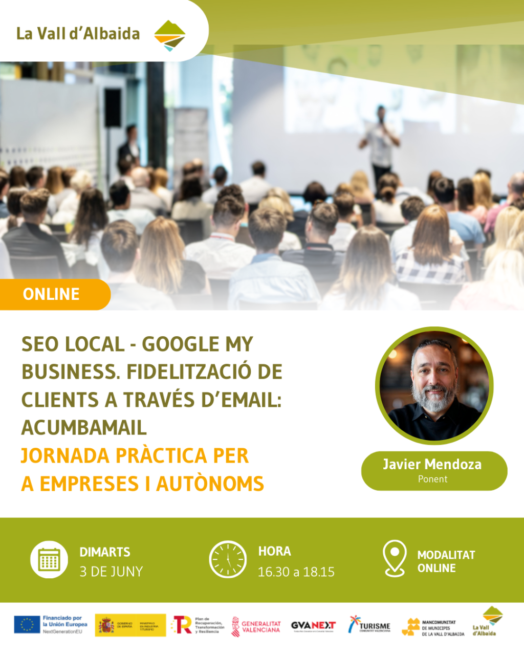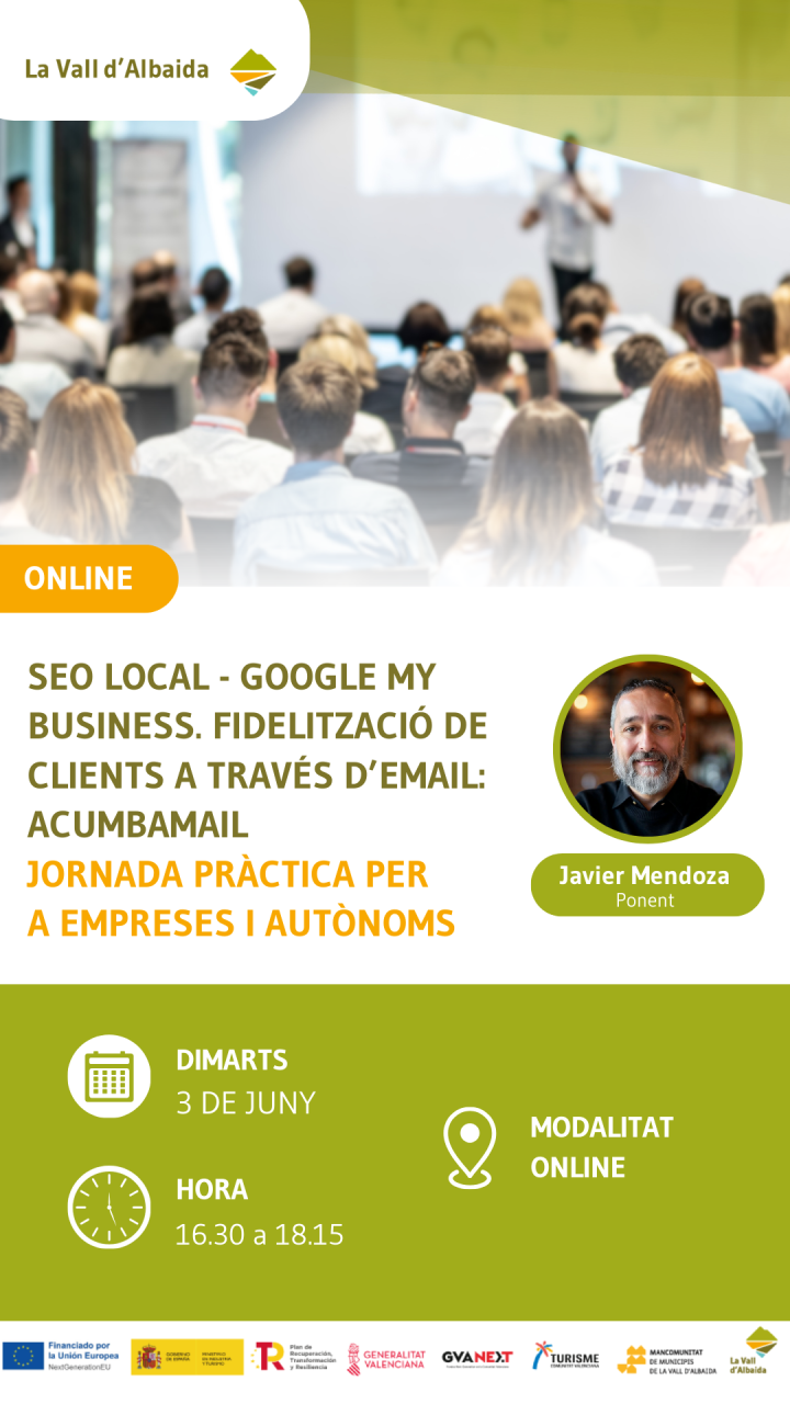 Si tens un negoci o eres autònom del sector turístic, no et perdes aquesta doble formació en línia, pràctica i enfocada a resultats. Aprén a optimitzar el teu perfil de Google My Business per a ser més visible i crea la teua primera campanya d’email màrqueting amb Acumbamail per a fidelitzar clients des del primer clic.