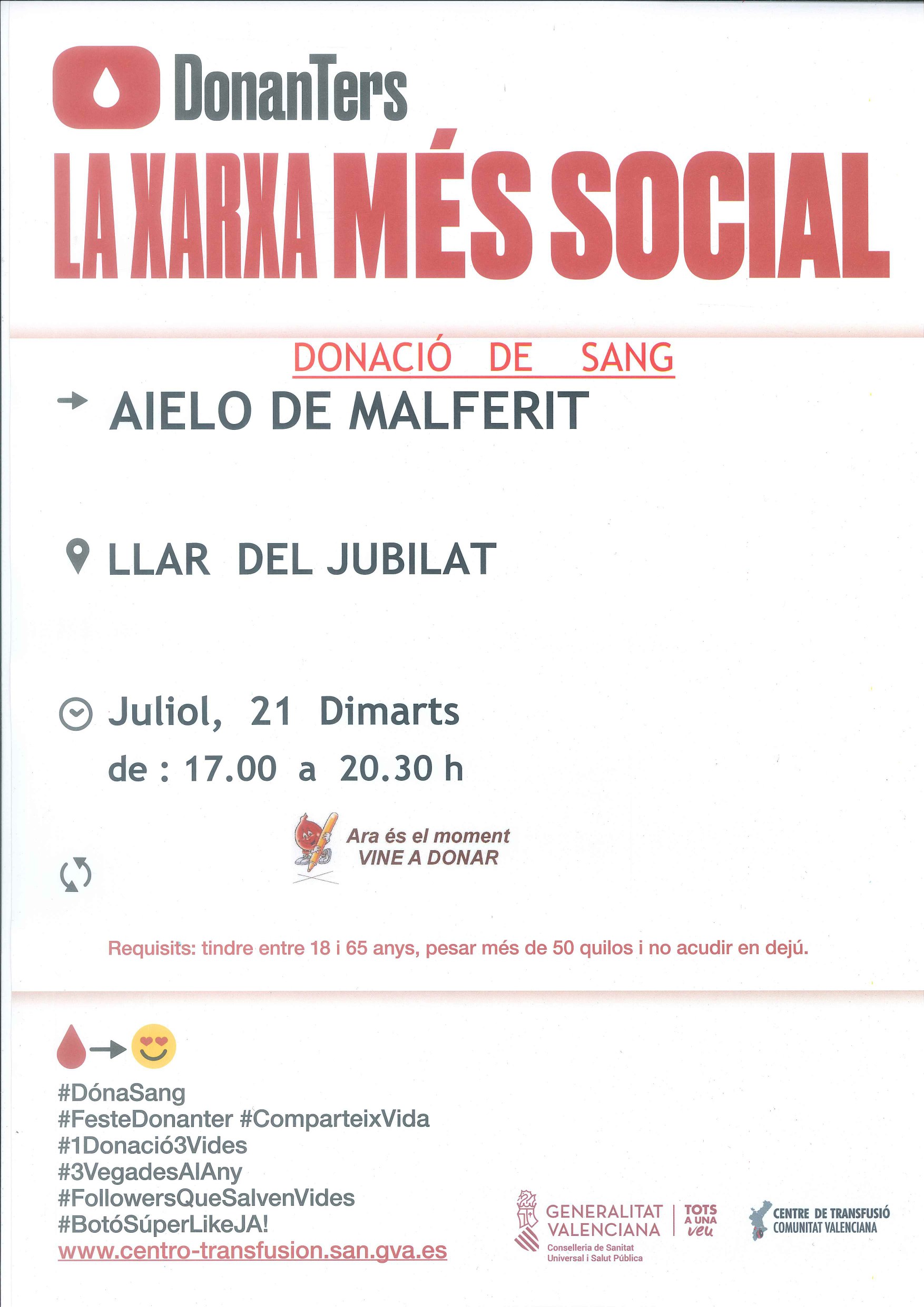 Donació de sang (Dimarts 21 de Juliol a la Llar del Jubilat) - Aielo de Malferit