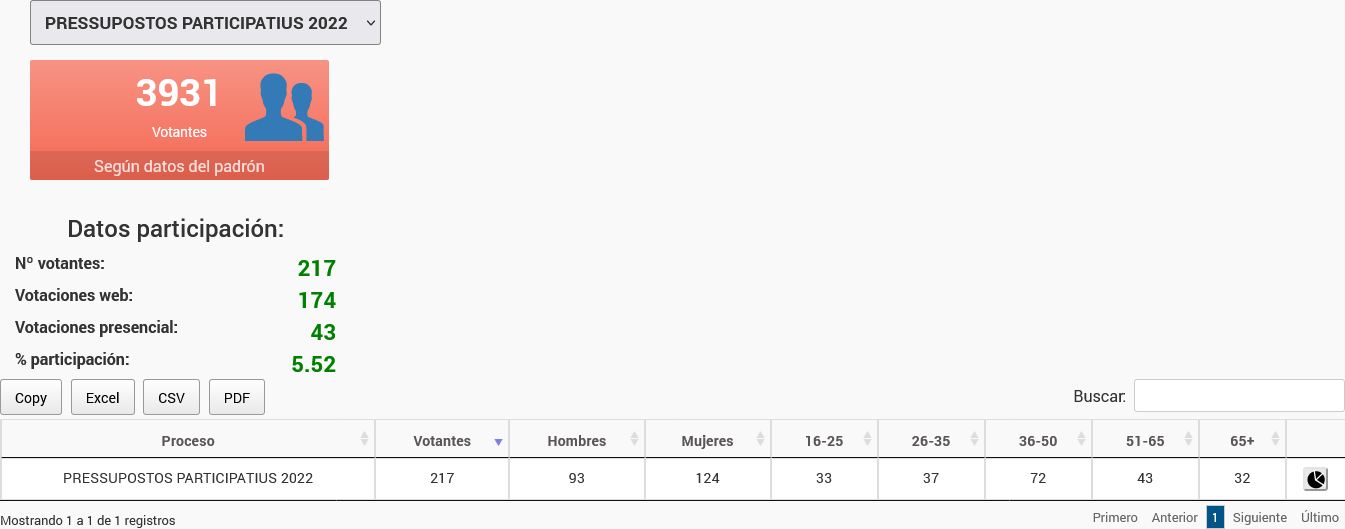 En esta primera experiència han participat un total de 217 persones (93 homes i 124 dones), el que suposa un 5’52% de participació, dels quals 173 persones han votat per la web i 43 presencialment a les dependències municipals.