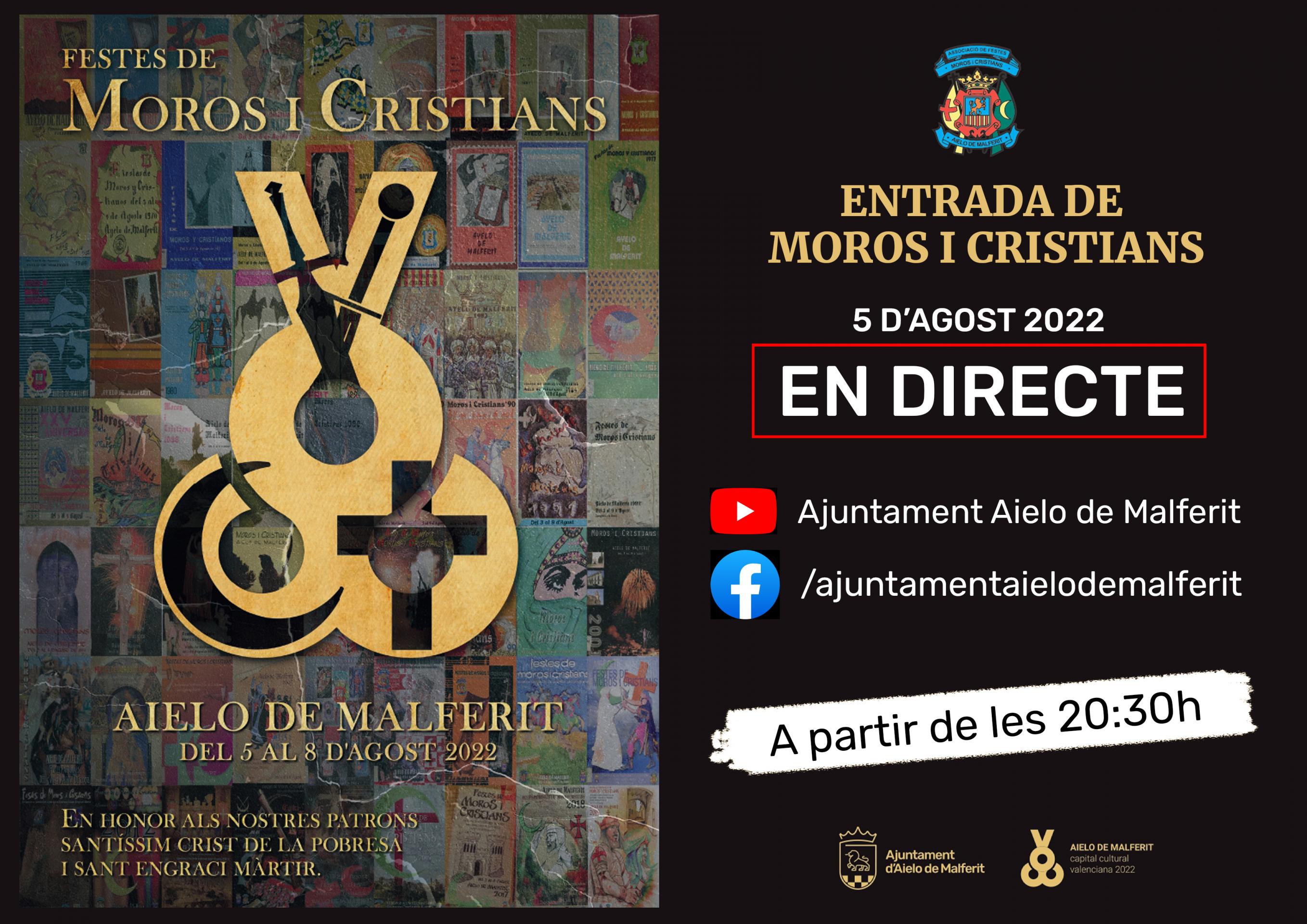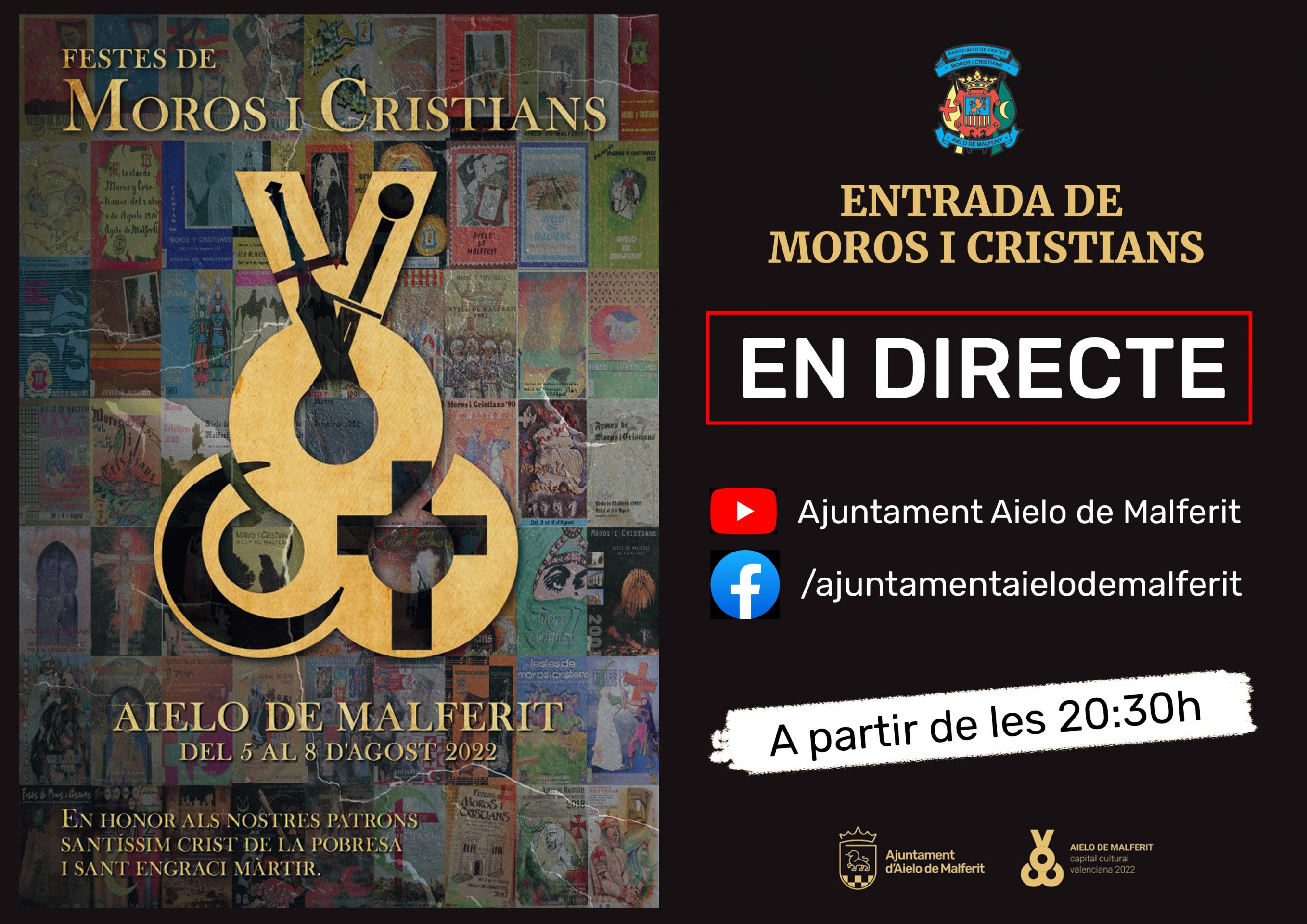 Aquest any s'emetrà per les xarxes de l'Ajuntament a partir de les 20:30 hores, la retransmissió en directe de l'entrada de Moros i Cristians, per tal d'apropar la nostra cultura i les nostres festes a tot arreu!