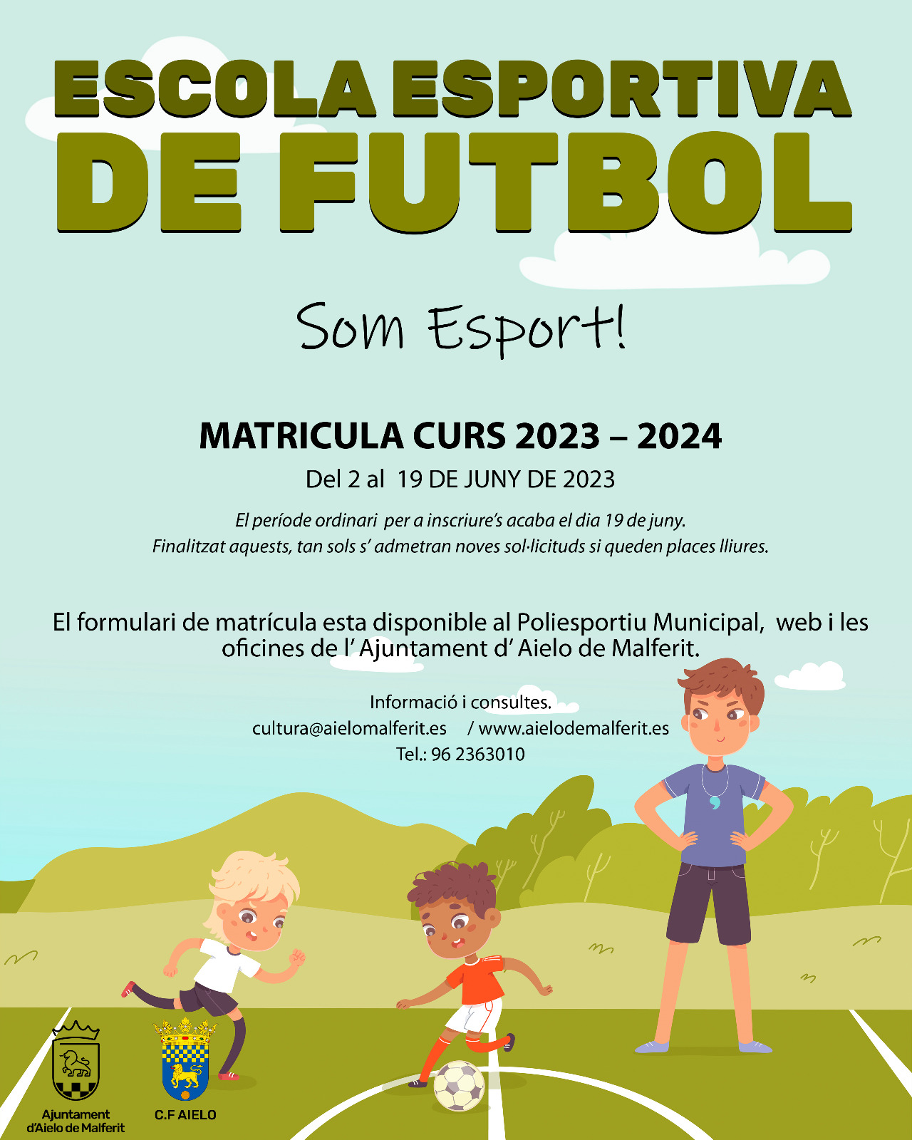 El formulari de matrícula esta disponible al Poliesportiu Municipal web i les oficines de l’Ajuntament d’Aielo de Malferit.