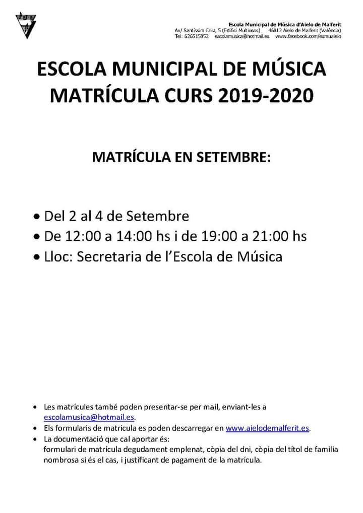 Escola Municipal de Música (Matrícula Curs 2019-2020) - Aielo de Malferit
