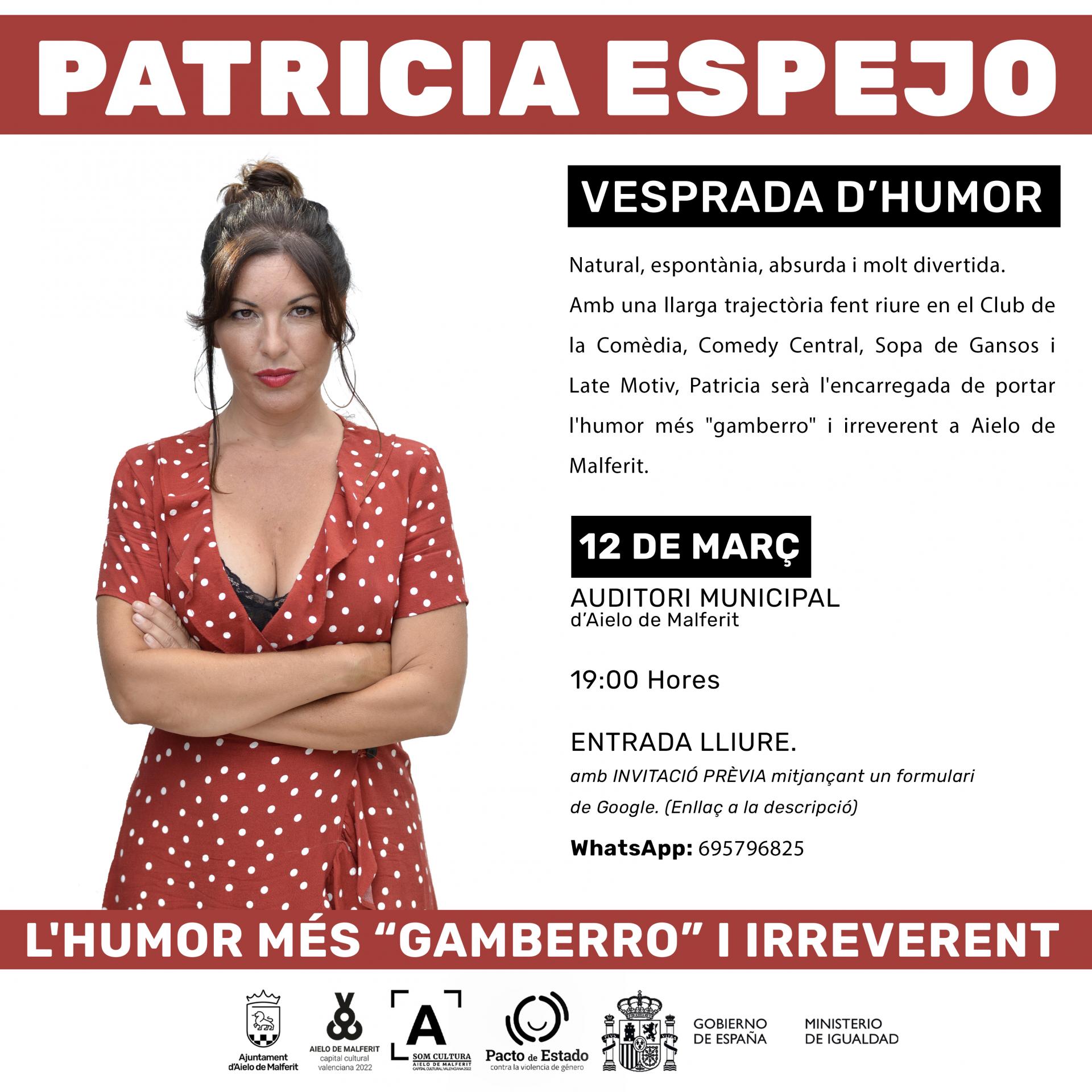 Natural, espontània, absurda i molt divertida. Amb una llarga trajectòria fent riure en el Club de la Comèdia, Comedy Central, Sopa de Gansos i Late Motive, Patricia serà l'encarregada de portar l'humor més "gamberro" i irreverent a Aielo de Malferit.