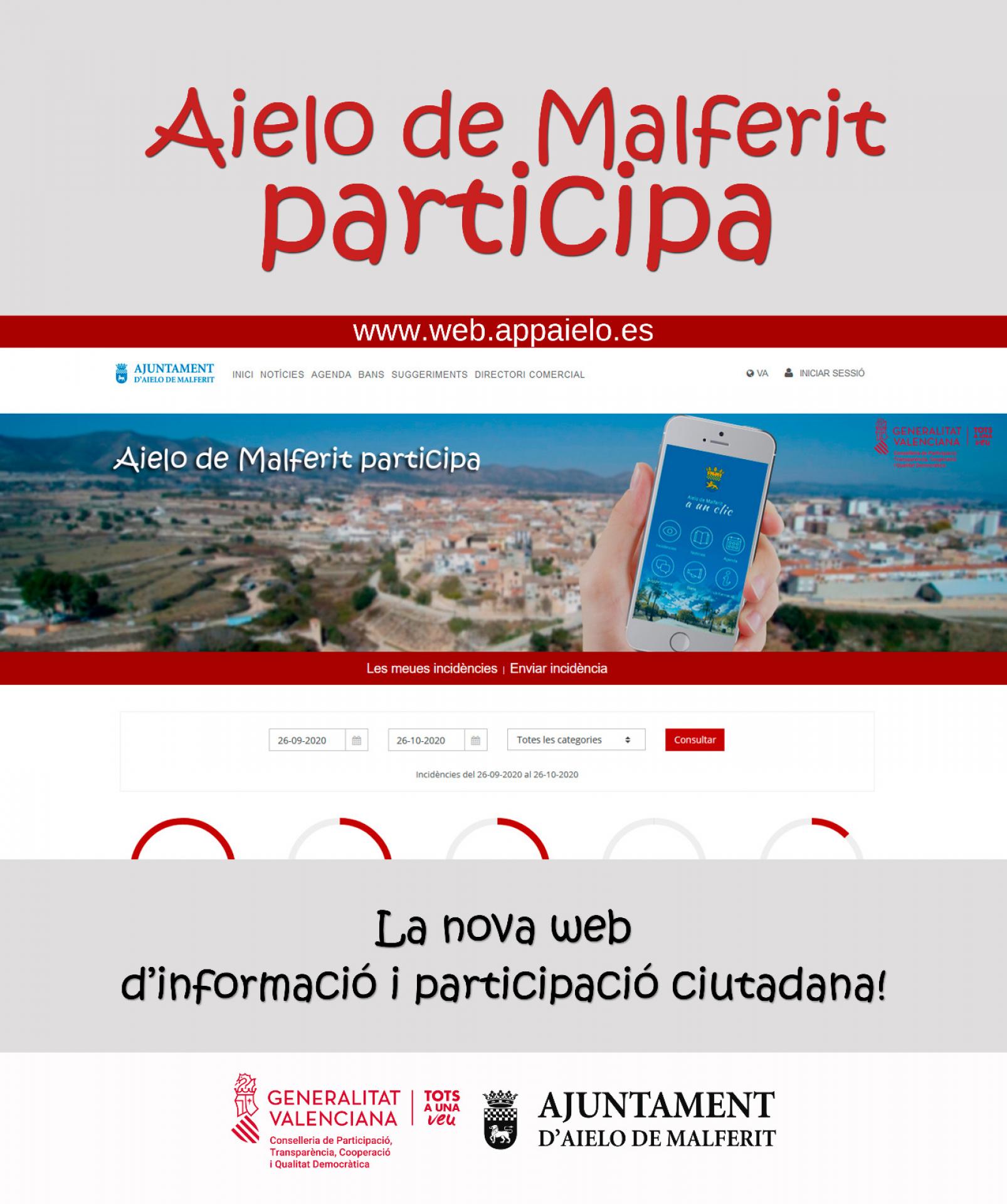 Des de la web municipal www.aielodemalferit.es es pot accedir directament des de la pastilla “Informació i participació ciutadana”, per enregistrar-nos i començar a participar en les enquestes i altres processos participatius, o in formar-nos de les novetats, notícies, bans i tots els esdeveniments i activitats que es desenvolupen en la localitat.