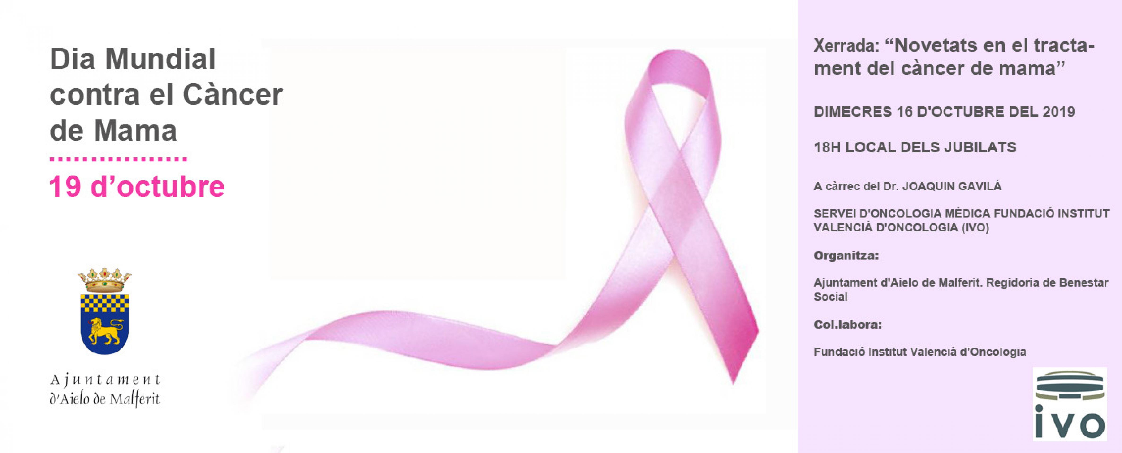 Amb motiu del Dia Internacional del Cáncer de Mama que es celebra el proper dimecres dia 19 d'octubre, la Regidoria de Benestar Social de l'Ajuntament ha organitzat aquesta xerrada en la que es parlarà de les novetats i avanços en el tractament del càncer de mama.