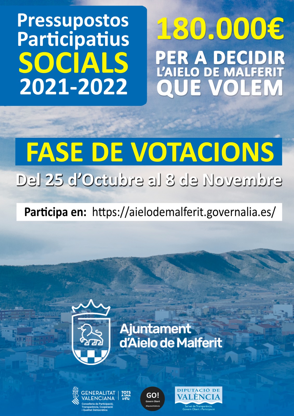 El proper dilluns dia 8 de novembre finalitzarà la fase de votacions dels pressupostos Participatius 2022 d’Aielo de Malferit.