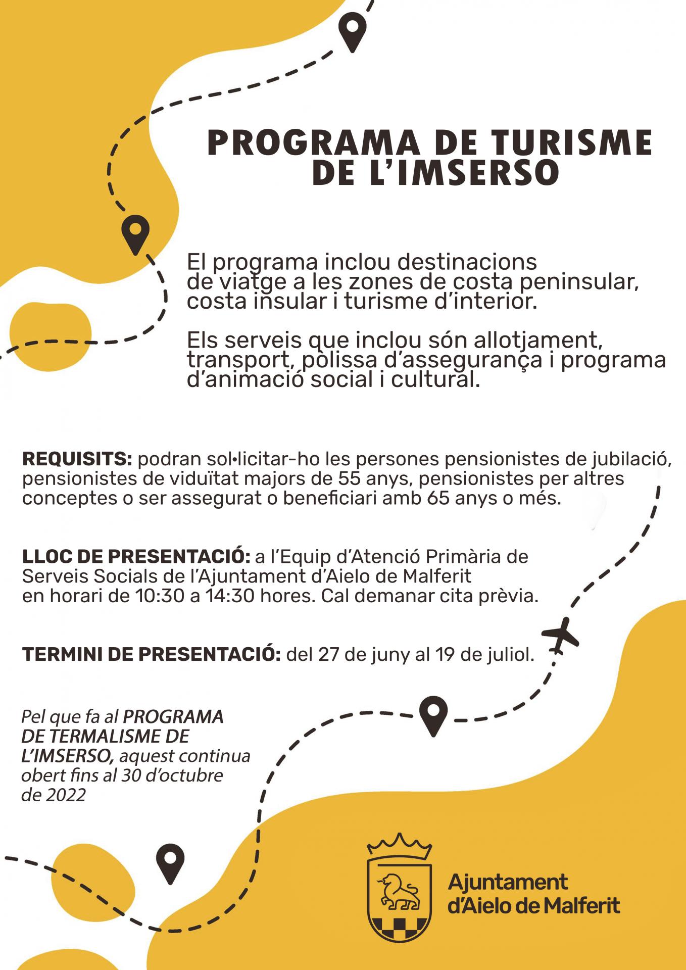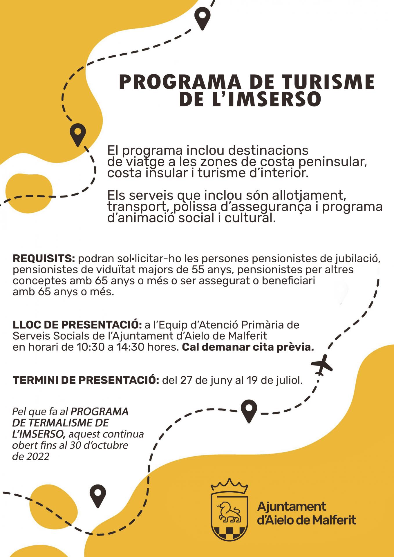 PROGRAMA DE TURISME DE L’IMSERSO (Termini de presentació fins al 19 de juliol) - Aielo de Malferit