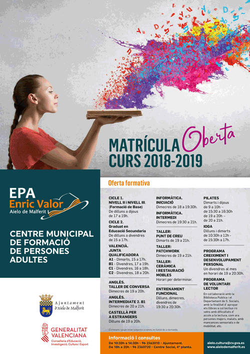 L’EPA Enric Valor d’Aielo de Malferit ha obert el seu període de matriculació per al curs 2018 – 2019.