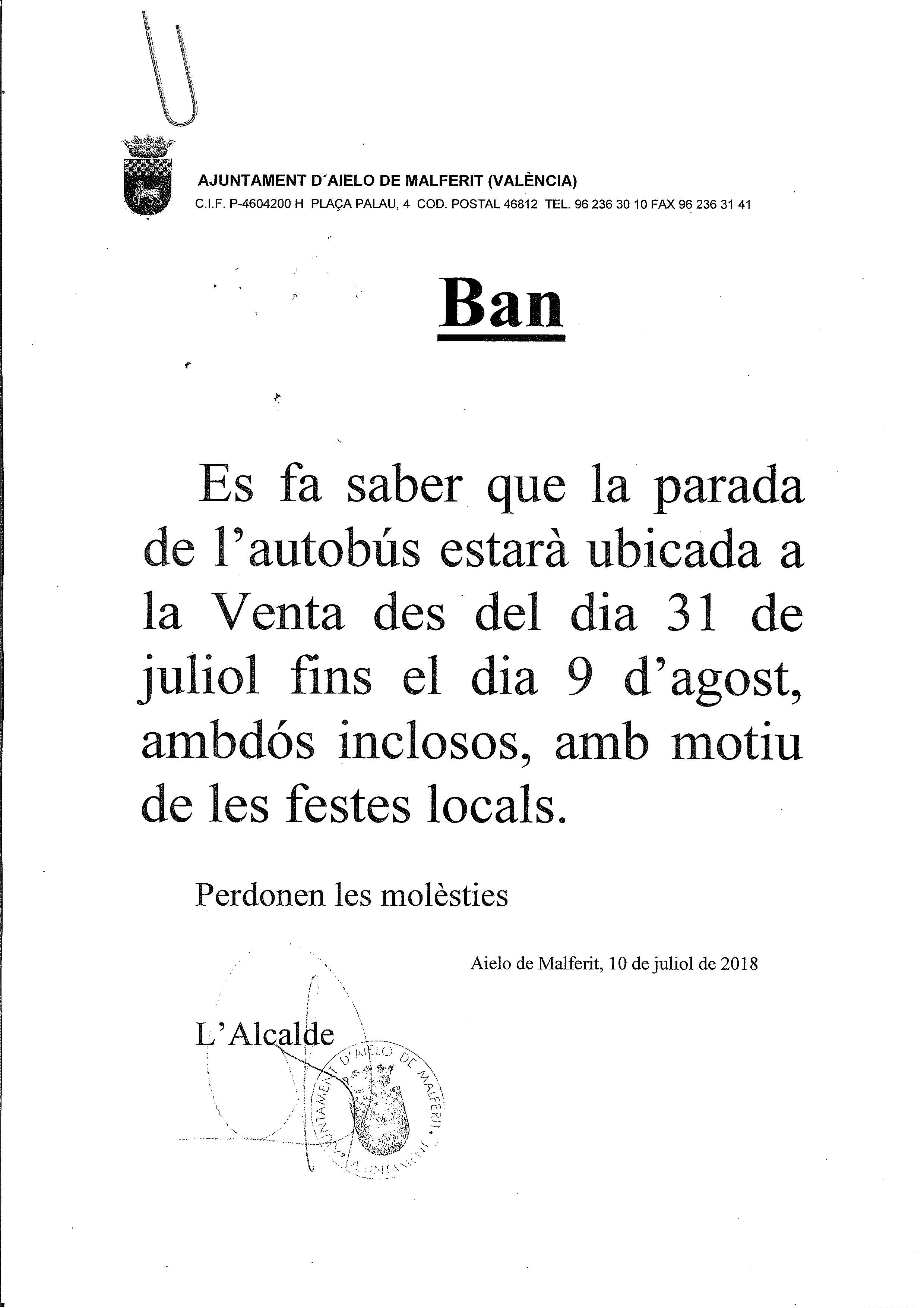 Des del dimarts 31 de juliol fins al dijous 9 d'agost, la parada del bus estarà ubicada únicament a la Venta, amb motiu de les festes locals.