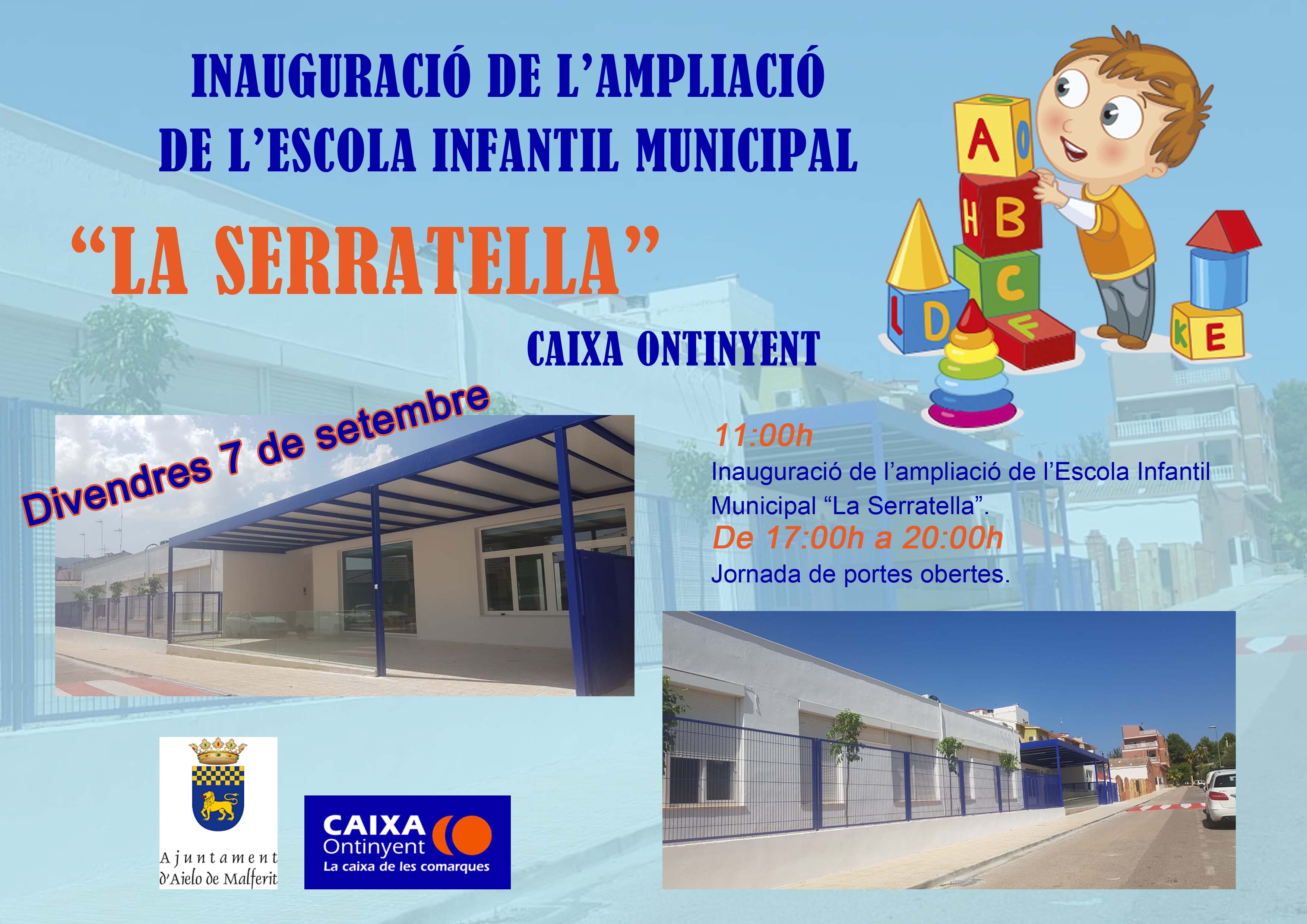 El proper divendres 7 de setembre a les 11:00 hores, tindrà lloc la inauguració de l’ampliació de l’Escola Infantil Municipal “La Serratella – Caixa Ontinyent” d’Aielo de Malferit.